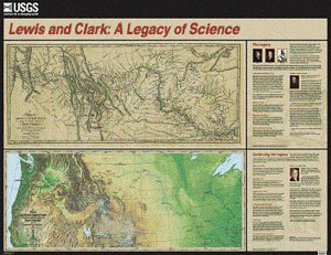 Lewis and Clark poster commemorating the bicentennial of this incredible journey of discovery features two maps in parallel view: above is a beautiful reproduction of the 1814 Lewis and Clark map; below is the same geographic area depicted with current remote sensing technology in a colorful image of the American Landscape.