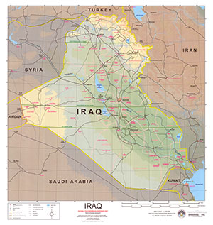 - PORTRAYS IRAQ'S MAJOR CITIES, TOWNS, AIRPORTS, HYDROGRAPHY,AND INTERNATIONAL BOUNDARIES, PORTRAYED AREA 33"(W) X 36" (H)