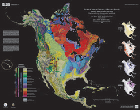 - This map (54.x42.) is a collaboration among the U.S. Geological Survey, the Geological Survey of Canada, and the Mexican Consejo de Resursos Minerales. The Tapestry map combines one-kilometer resolution digital elevation data with a new geological map from the Decade of North American Geology Geologic Map. On the main part of the map, the ages of rocks depict the geological history of the continent. Inset maps show the distribution of four major rock types: sedimentary, volcanic, plutonic, and metamorphic. The scale of the main part of the map is 1 to 8 million, using a Lambert Azimuthal Equal Area Projection. For more information and to view the map online, visit: http://pubs.usgs.gov/imap/i2781/
