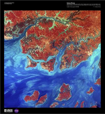 - Guinea-Bissau is a small country in West Africa. Complex patterns can be seen in the shallow waters along its coastline, where silt carried by the Geba and other rivers washes out into the Atlantic Ocean.