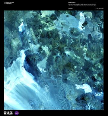 - Steep-sided volcanic cones along the Chilean-Argentinean border add texture to this "study in blues." Of approximately 1,800 volcanoes scattered across this region, 28 are active.