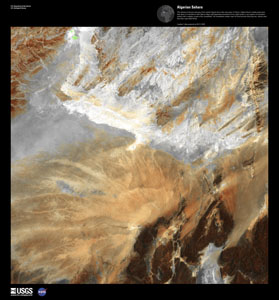 - This abstract in browns and grays from central Algeria shows that some parts of Africa's Sahara Desert contain much more than dunes of wind-blown sand. Barren ridges and fragmented mountains (lower right) border a vast expanse of arid plains etched with a complex system of dry streambeds. The streambeds contain water for brief periods following rare, intense rains that often cause flash floods.