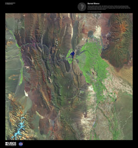 - San Juan, Argentina, nestles in a fertile valley flanked by arid mountains. Croplands and vineyards (green) abut the metropolitan area on the San Juan River. The white "teardrop" (lower left) is an ancient lakebed called Barreal Blanco. It is one of the best places in the world for carrovelismo, or landsailing, thanks to the steady winds that sweep across this flat, unobstructed expanse of hard-packed sediment.