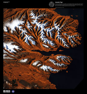 - This stretch of Iceland's northern coast resembles a tiger's head complete with stripes of orange, black, and white. The tiger's mouth is the great Eyjafjorour, a deep fjord that juts into the mainland between steep mountains. The name means "island fjord," derived from the tiny, tear-shaped Hrisey Island near its mouth. The ice-free port city of Akureyri lies near the fjord's narrow tip, and is Iceland's second largest population center after the capital, Reykjavik.