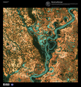 - Small, blocky shapes of towns, fields, and pastures surround the graceful swirls and whorls of the Mississippi River. Countless oxbow lakes and cutoffs accompany the meandering river south of Memphis, Tennessee, on the border between Arkansas and Mississippi, USA. The "mighty Mississippi" is the largest river system in North America.