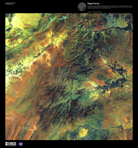 - Hues of green and orange highlight the extreme ruggedness of the mountainous terrain in eastern Afghanistan, near its border with Pakistan. The dark green areas on the right side along rivers indicate agricultural areas. Snow-fed streams allow sufficient irrigation to transform relatively arid soils into productive fields.