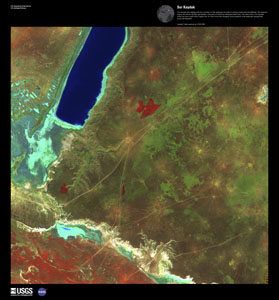 - The intricate lines angling and criss-crossing over the landscape are roads in extreme southwestern Kazakhstan. The turquoise areas to the left are salt flats and marshes, some parts of which are submerged (dark blue). The water body is Sor Kaydak, which was once a gulf of the Caspian Sea. As water levels have dropped, curious patterns in the landscape emerged that reveal old tributaries. Collection: Earth as Art 3 Source: Landsat 5 Scale: KML: View KML Download: JPG TIF Readme: View readme.txt