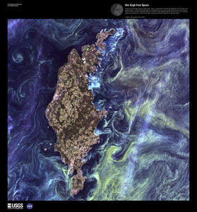 - In the style of Van Gogh's painting "Starry Night," massive congregations of greenish phytoplankton swirl in the dark water around Gotland, a Swedish island in the Baltic Sea. Phytoplankton are microscopic marine plants that form the first link in nearly all ocean food chains. Population explosions, or blooms, of phytoplankton, like the one shown here, occur when deep currents bring nutrients up to sunlit surface waters, fueling the growth and reproduction of these tiny plants. Collection: Earth as Art 3 Source: Landsat 7 Scale: KML: View KML Download: JPG TIF Readme: View readme.txt