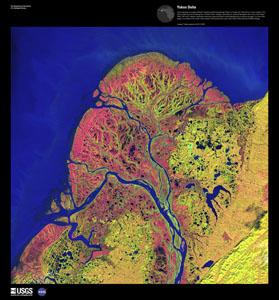 - After beginning in northern British Columbia and flowing through Yukon in Canada, the Yukon River crosses Alaska, USA, before emptying into the Bering Sea. Countless lakes, sloughs, and ponds are scattered throughout this scene of the Yukon Delta. The river's sinuous, branching waterways seem like blood vessels branching out to enclose an organ. It is one of the largest river deltas in the world, and currently (2010) protected as part of the Yukon Delta National Wildlife Refuge.