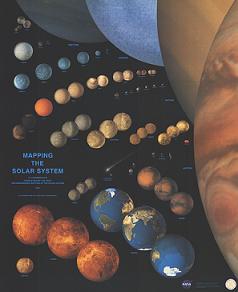 - This colorful poster produced by NASA displays the various planets and satellites that make up our solar system. The reverse side displays text and a line drawing with the true relative size of each of their names by an outline scaled to the base scale. These maps are great educational tools for children and anyone else interested in our solar system.