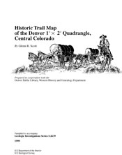 - "Historic Trail Map of the Denver 1 by 2 Degree Quadrangle, Central Colorado," by Glenn R. Scott, retired USGS geologist, features a smorgasbord of historical information, including the locations of Indian , early immigrant and cattle trails, as well as stage routes, stage stops, toll roads, toll gates existing and abandoned railroads, ghost towns, military camps, mountain passes, ranches, quarries, mines, archeological sites and vertebrate fossil sites. The area of the quadrangle encompasses Breckenridge, Colorado Springs, Limon and Brighton. A 53-page text pamphlet complements the 2-sheet map. Use this map to understand the affect of Native Americans, mining, agriculture, and urban growth on the region, and how historical routes influenced the location of present-day cities and transportation. Map scale is 1:250 ,000 and measures 49"x38". ** Sold as a set. ** Visit our Geology Publications Website at: http://cpg.cr.usgs.gov/pub/i-maps.html