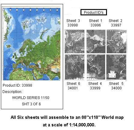 - This map consists of international boundaries, country names, capitals and selected cities and towns. Multicolor tints distinguish topographic, hypsometric, hydrographic and bathymetric features. Shaded relief accentuates mountain ranges. Shipping lanes are also known. Clock time is displayed at 15-degree intervals of longitude. Marginal data on the maps include a sheet index, a legend for populated places, ice limits, boundary symbols, and tint-band guides. ** Use this map for teaching and learning about the world's physical regions, continents, oceans, and landforms. ** Available in three sizes: * Size 1: A single sheet, 42"x56" at a scale of 1:30,000,000. ** Size 2: Three sheets that assemble to a 55"x74" map at a scale of 1:22,000,000. *** Size 3: Six sheets that assemble to an 88"x118" map at a scale of 1:14,000,000. ** All maps sections can be ordered individually. * Product ID Number for World Map 1 Sheet - 33992 ** Product ID Number for World Map 3 Sheet - 33993, 33994 and 33995 *** Product ID Number for World Map 6 Sheet - 33996, 33997, 33998, 33999, 34000, and 34001