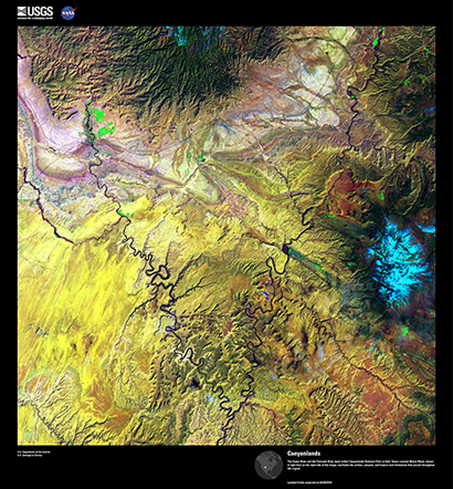 The Green River and the Colorado River meet within Canyonlands National Park in Utah. Snow-covered Mount Waas, shown in light blue on the right side of the image, overlooks the arches, canyons, and bizarre rock formations that prevail throughout this region.